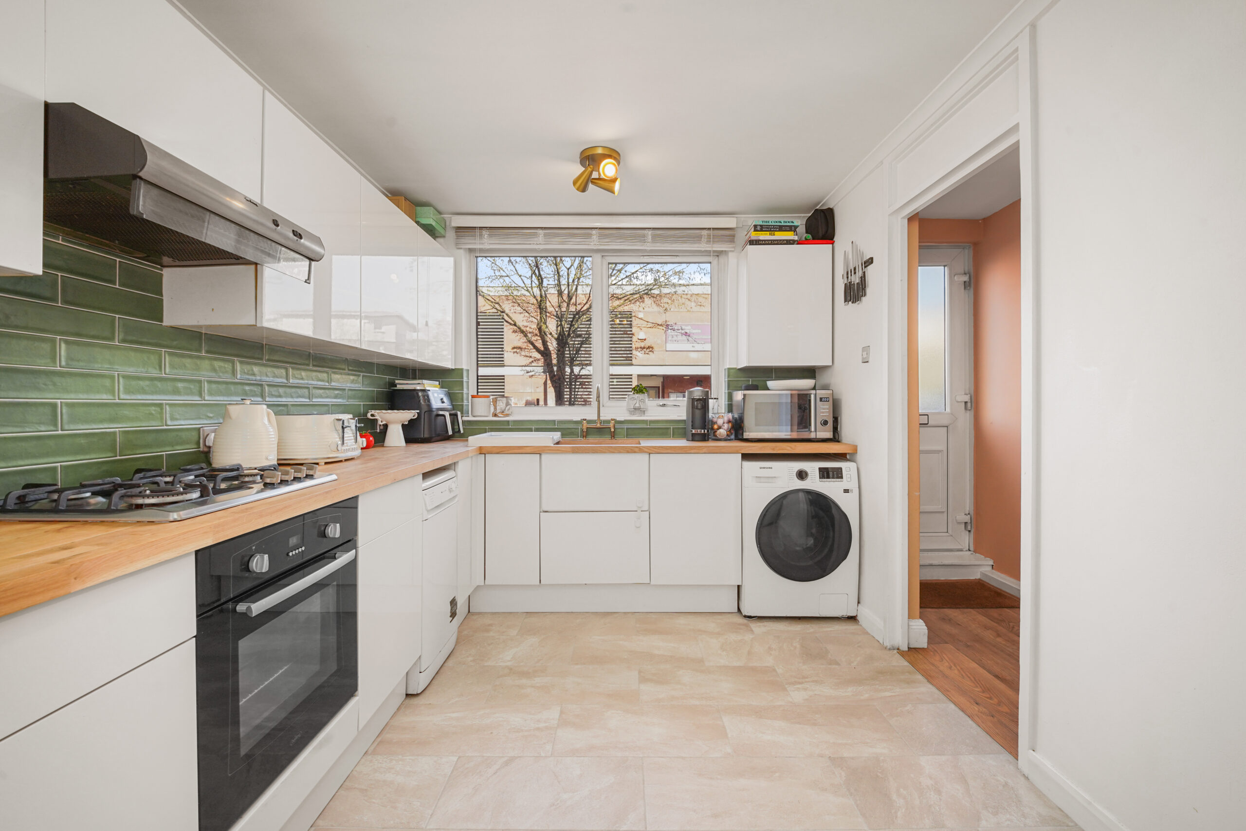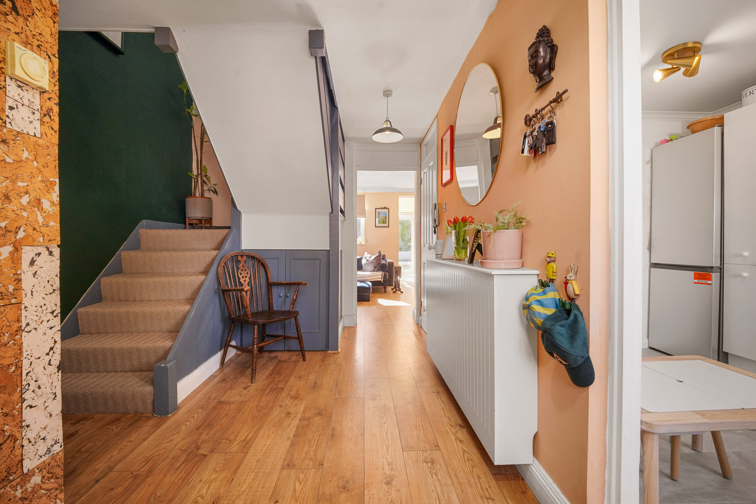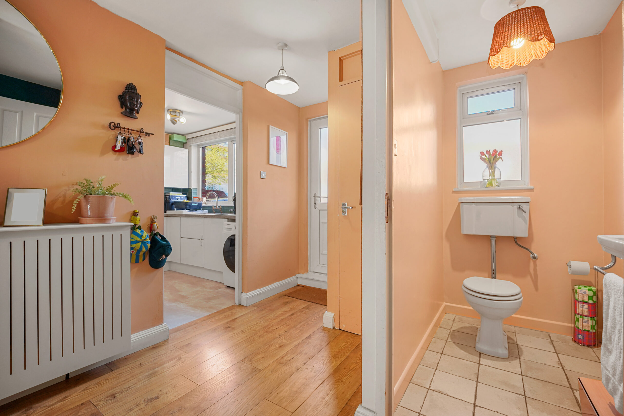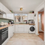 On entering, you step into a spacious hallway with two generous storage cupboards, ideal for bikes or prams, along with a convenient downstairs cloakroom. To the right sits a recently modernised kitchen, with a large front facing window that fills the space with natural light.